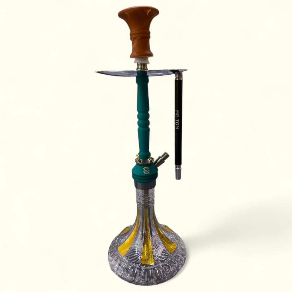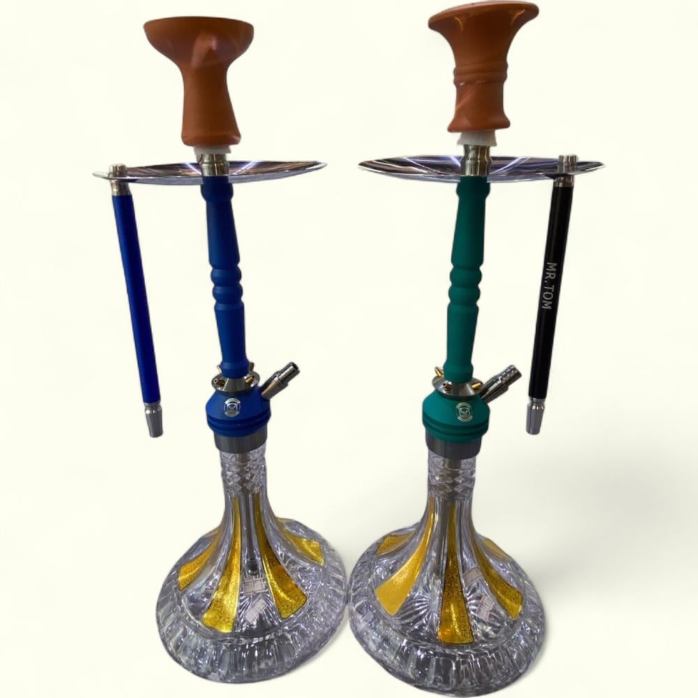 قاعدة كريستال شفافة بزخارف ذهبية براقة تعكس الفخامة في كل زاوية، وعمود معدني متين بلون أنيق يمنح الشيشة حضوراً يخطف الأنظار.